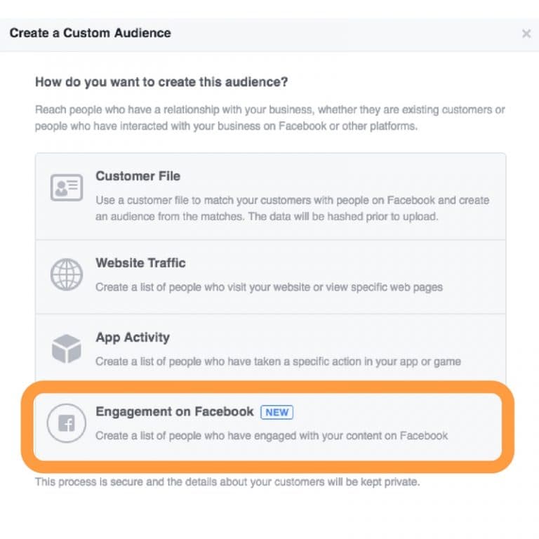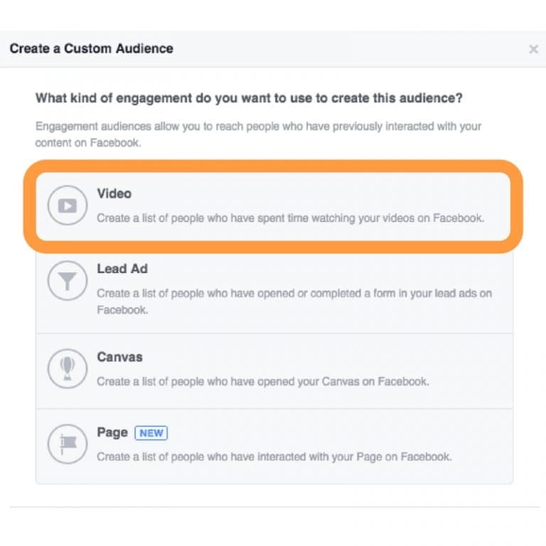 When you select this option to build a new custom audience, the top option is for video engagement. You’re now able to “create a list of people who have spent time watching your videos on Facebook,” and target them with related content.